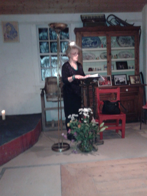 The Poetry Cafe at The Haggart was the first of what I hope might be many. I don’t know how quite to describe it. It looked lovely (thanks to Julie) furnished like a cafe, soft light, red and white tablecloths, flowers, candles, plates of cakes and biscuits and home made bread, tea or whatever beverage people brought with them. And what a fascinating collection of diverse poets from Longford, Leitrim and Cavan (The Haggart is where the three provinces meet)!