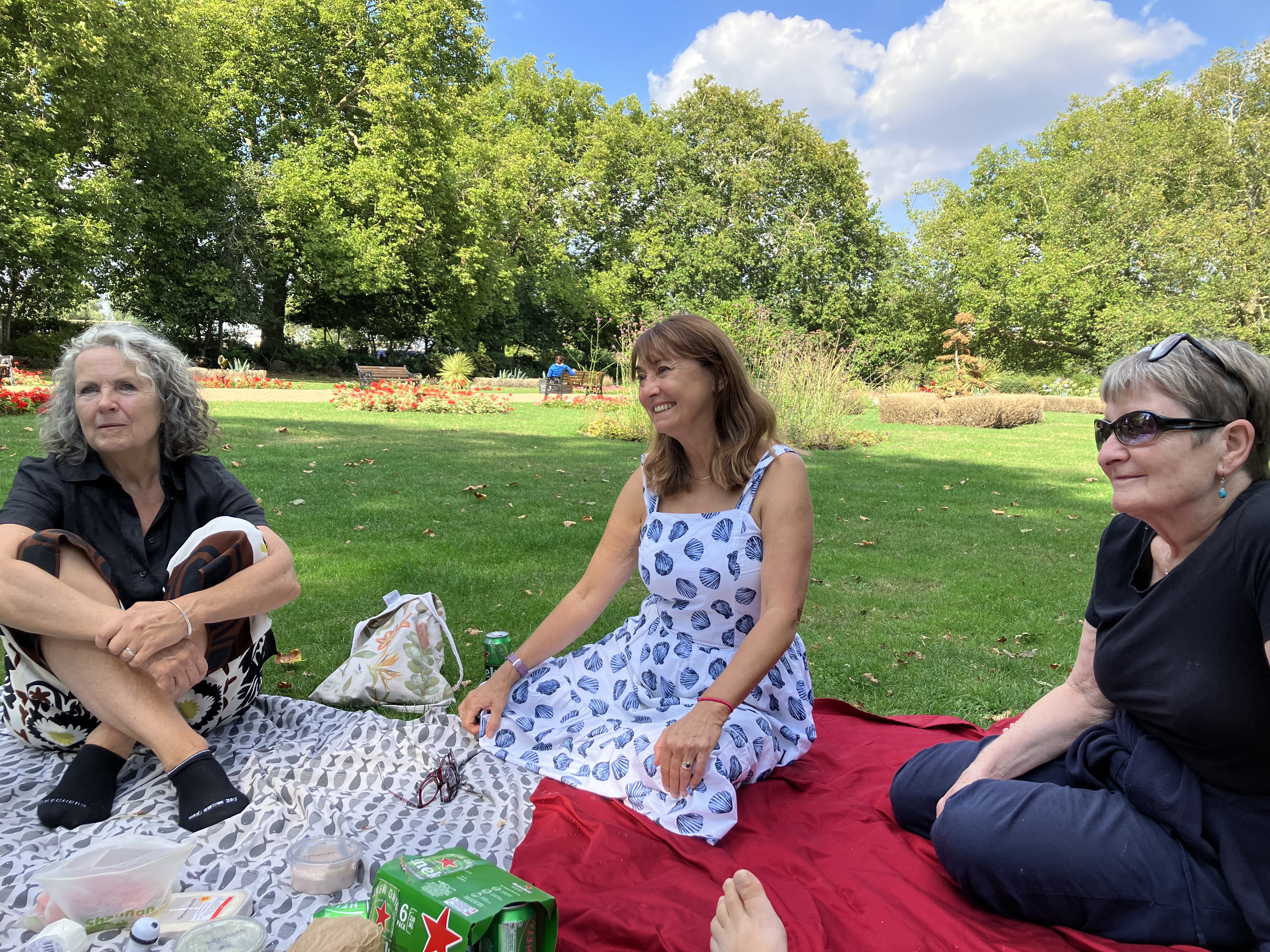 After lots of hugs and farewells, we made our way along the M1 accompanied by thunder, lightening and lashing rain, floods, more variable speed limits and low emission zones (no locusts). At this stage we were hoping that our Irish number plates would provide some protection from these unknown and rather alarming warnings and announcements. Again, thanks to Mrs Google, we got to our destination where Maria welcomed us with delights from Waitrose. Over the weekend, we had a lovely picnic for the friends and Family in Finsbury Park (thank you, Maria and Waitrose), and there, while we continued the debate on poor leadership, trans issues, and outdoor swimming opportunities, Pops chased squirrels and rats through bushes and burrs so that she became more burrdog that collie! The next morning, I had to spray her with coconut, vegan kitchen oil, and spend three hours picking them out to release her tail back to its former glory.