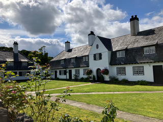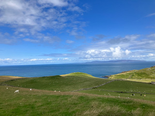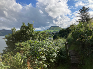 The first evening we strolled into town from our first guest house and got our bearings. We wandered down to the beach and while Jerry ambled around the prom and playing fields, I went up the cliff walk which was stunning and well maintained. I was lucky, the sun came out, and the sea turned blue. The clouds turned into fluffy cottonwool and the butterflies fluttered about (I haven’t seen many butterflies this year). The views were amazing and my heart soared. At the top I came across the old ruins of Layd Church, chief burial place of the MacDonnells. It was nestled very prettily among the lovely houses and small fields of sheep scattered among the bushes and trees of the Glens. I wended my way back to the town, passing and examining the architecture of the beautiful homes on the way down. I bumped into Jerry at the bottom at Cottage Wood which we decided to explore the next day as now it was time for an aperitif at Harry’s Fish Bar where I concluded my evening with the best seafood tagliatelle I had eaten for ages.