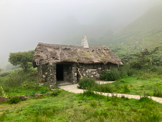 At breakfast later, Rose, our landlady said that on our way home we should go on a jaunt to the Hidden Village, another GoT place, as it was on our way to Ballymena where we were going to Sainsbury’s (to pick up a few Goosebury Fools – nothing, I should add, to do with GoT). It had become a gloomy, misty morning…the perfect atmosphere to climb an outcrop of rocks over a grey foggy sea in search of a Hidden Village. We didn’t even know the story behind the Hidden Village, and Jerry didn’t remember it in the series. Never mind…by this time we were loyal GoT sight seers, so up we traipsed. At one point, out of the gloom three people emerged…locals who told us that before we left the area, we should visit St Killian’s school around the next glen which was built by the grandmother of Winston Churchill. It was nothing to do with GoT but when we saw it, we wondered why not.